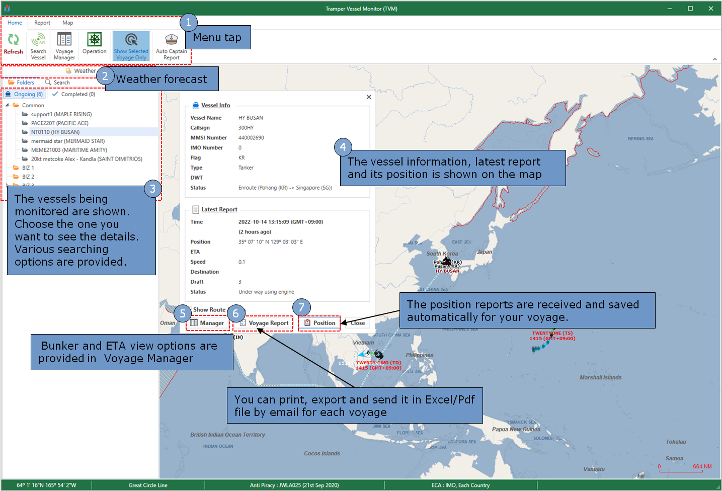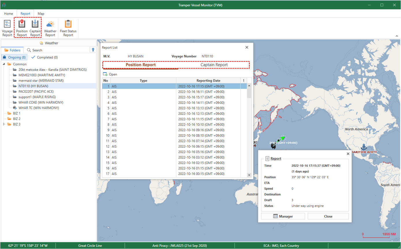 It monitors vessel position using satellite and terrestrial AIS , and Captain’s Report.