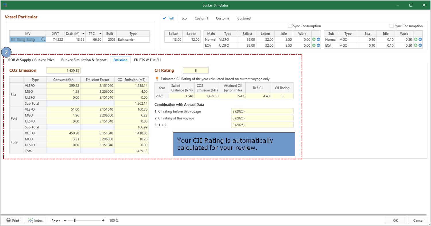 The CII rating is automatically calculated and forecasted for your review. You can also simulate and compare CII ratings by varying factors.